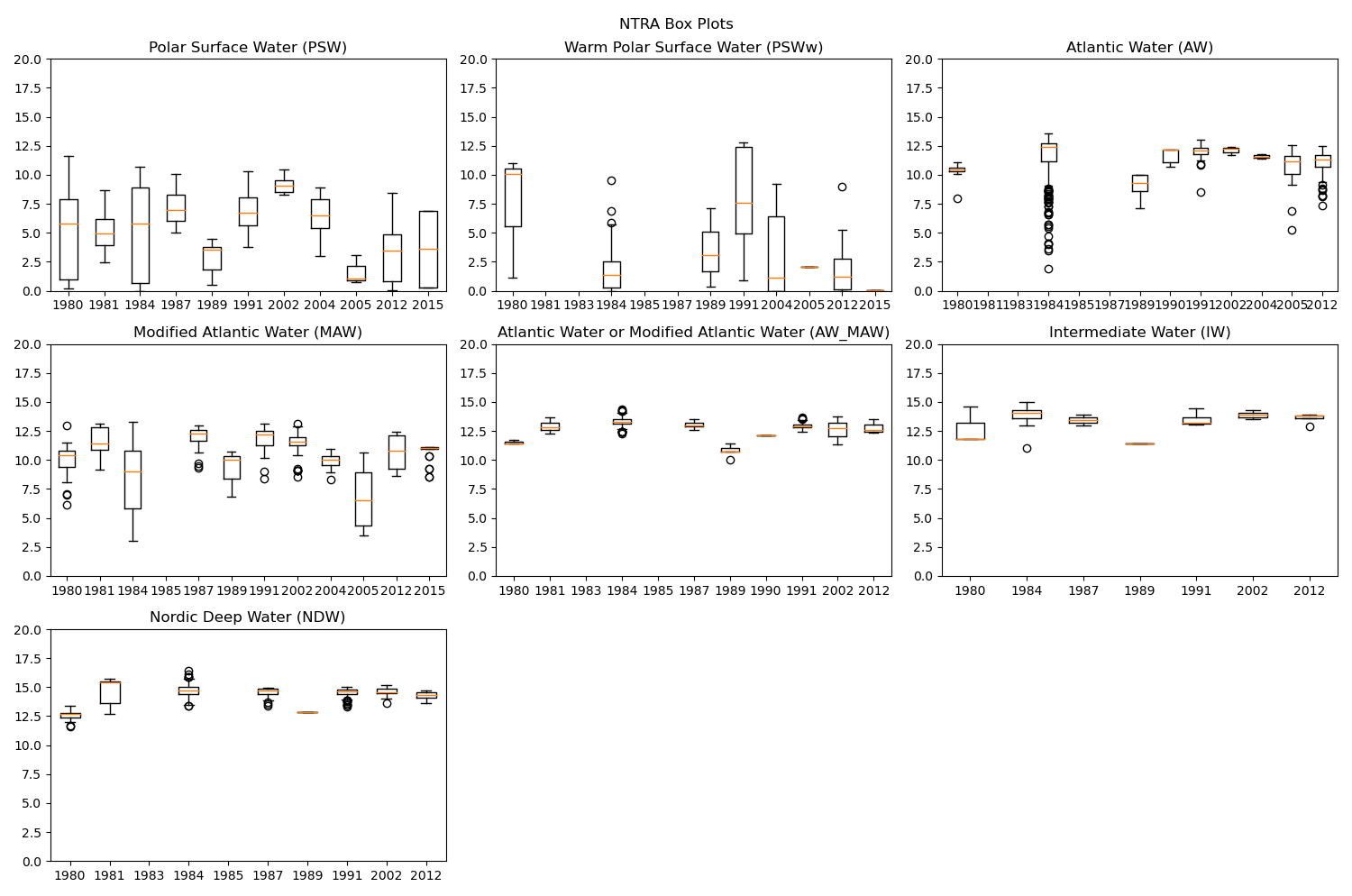 When executed, this script displays Box plots for a given variable, on multiple given water masses.